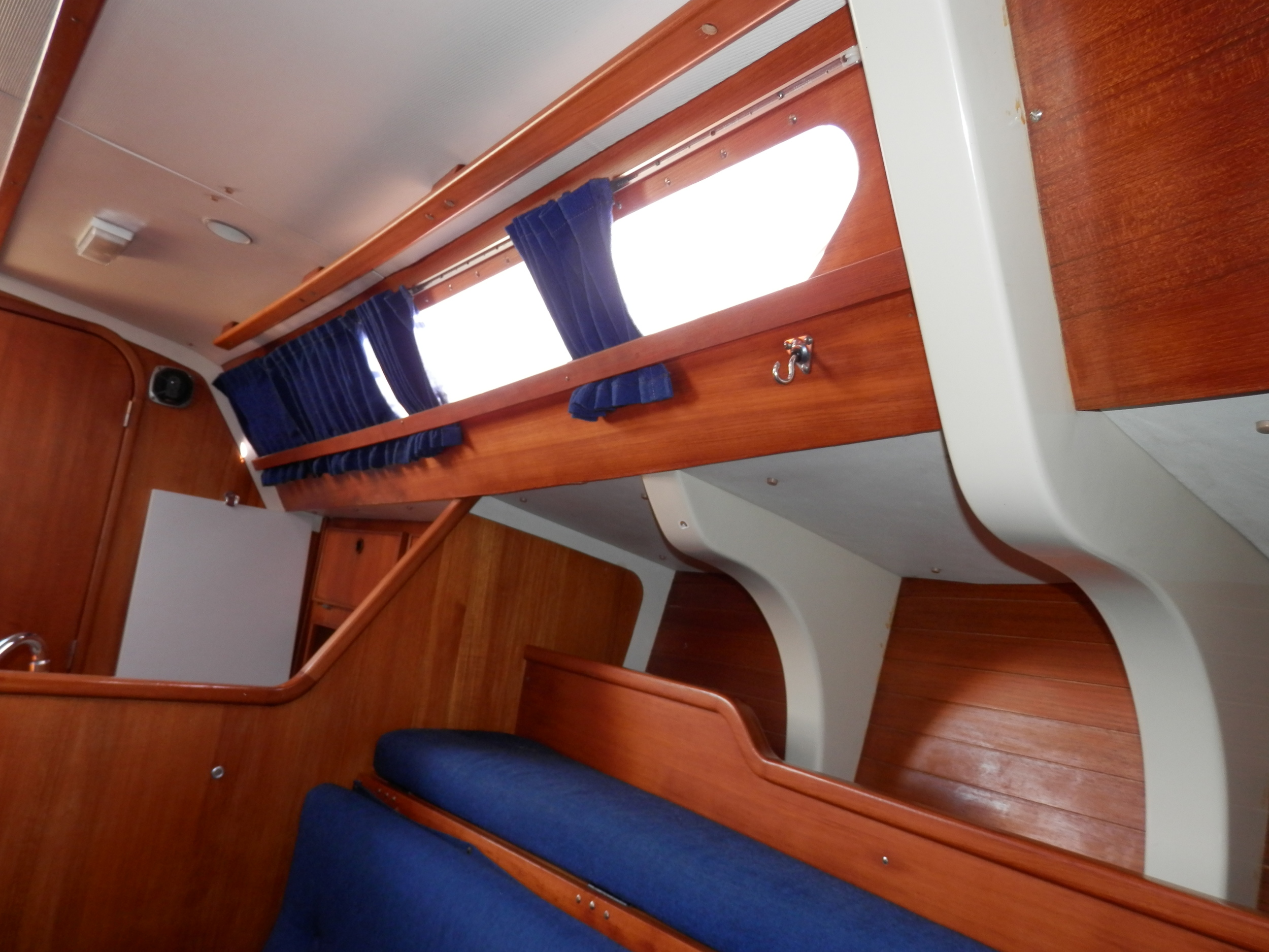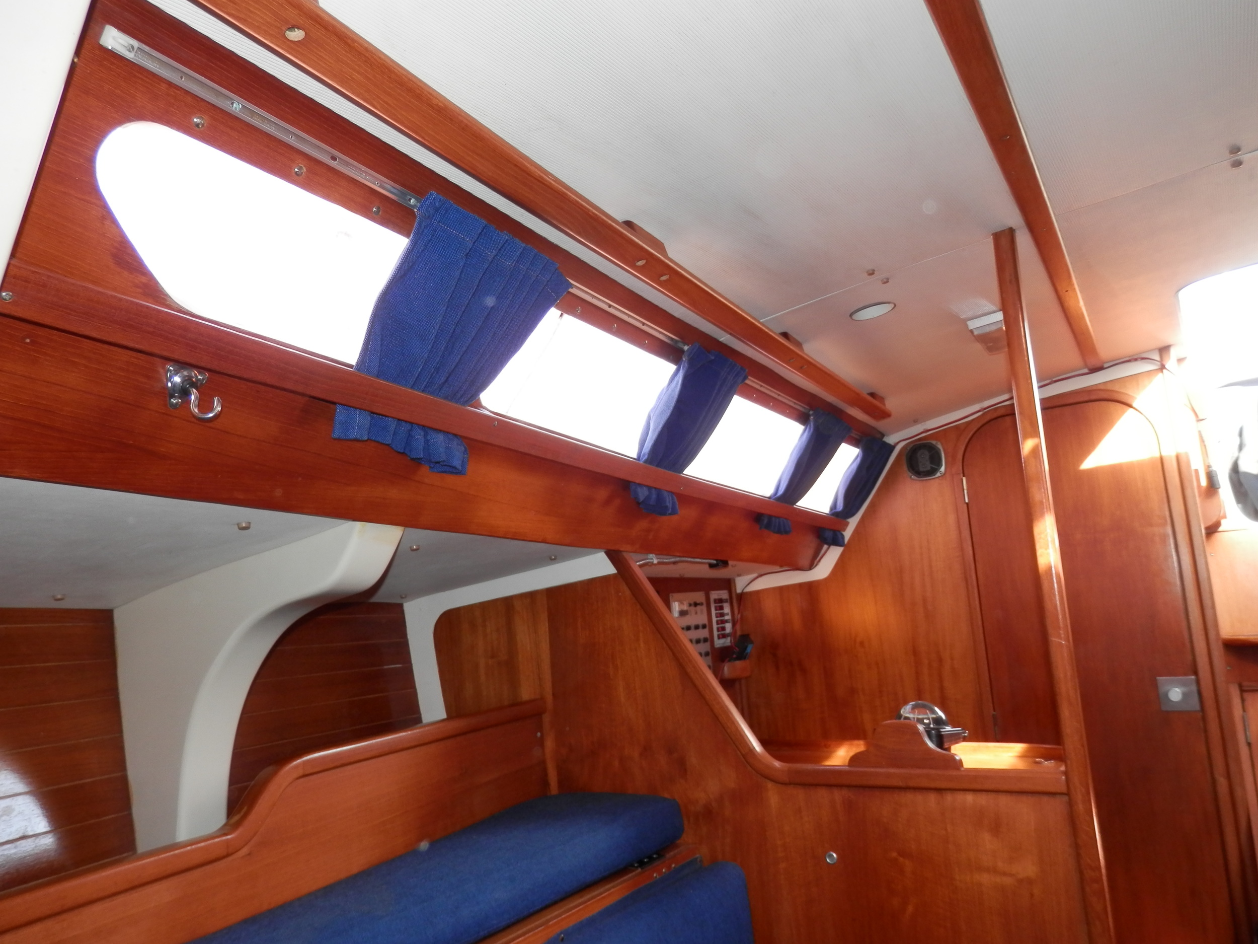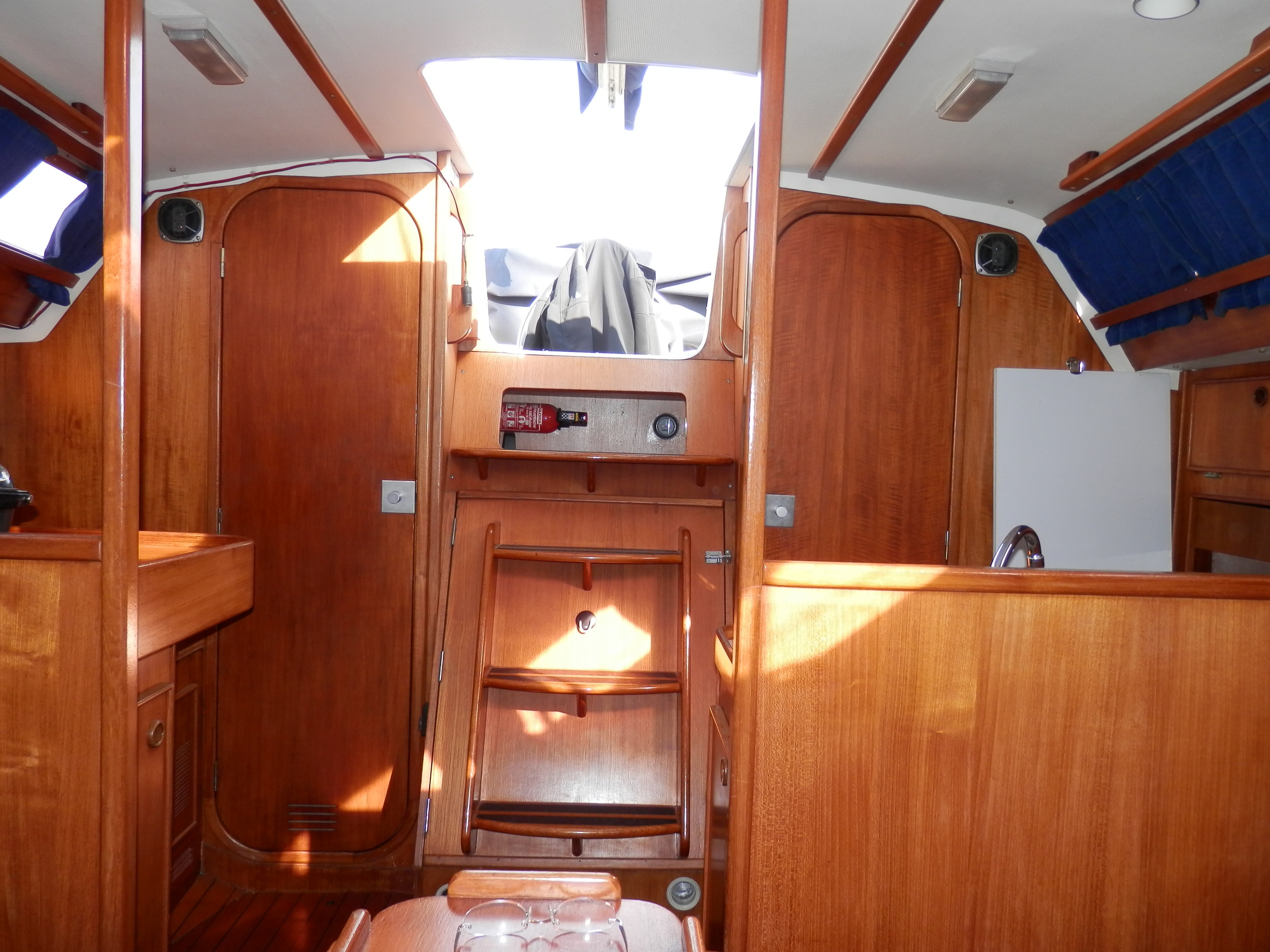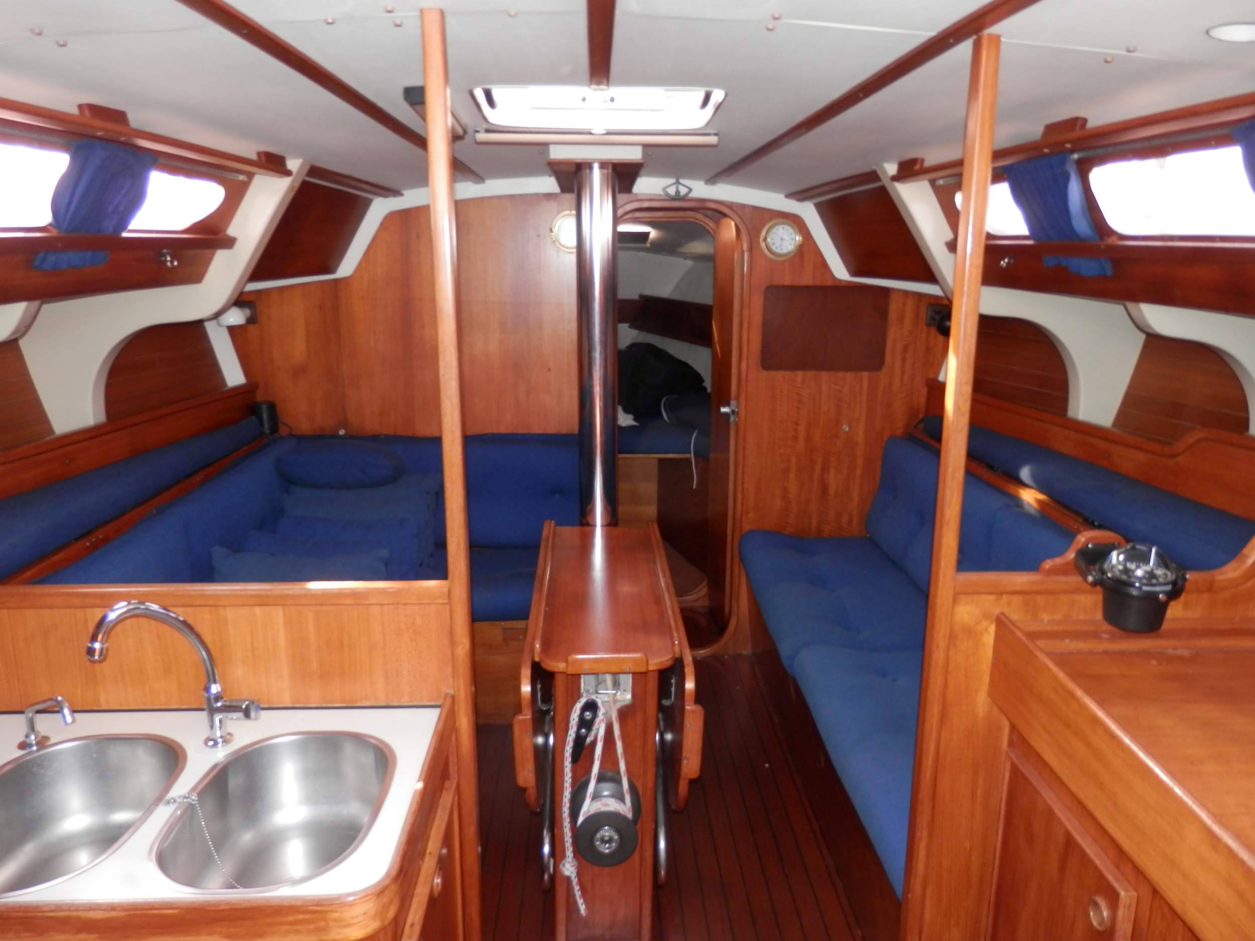 Het interieur is van gelakt teak en de boot biedt zowel veel leefruimte als opberg mogelijkheid. De salon heeft een zithoek met en uitklapbare tafel in het midden waarin de zwaard bediening is gemonteerd. Aan bakboord is een L-vormige keuken met bovenlader koeling en veel opbergmogelijkheid voor proviand. Naast de ingang stuurboord is de navigatie tafel. Er zijn 6 slaapplaatsen in de drie hutten en 4 extra slaapplaatsen in de salon. De natte cel is aan bakboordboord naast de ingang van het vooronder.