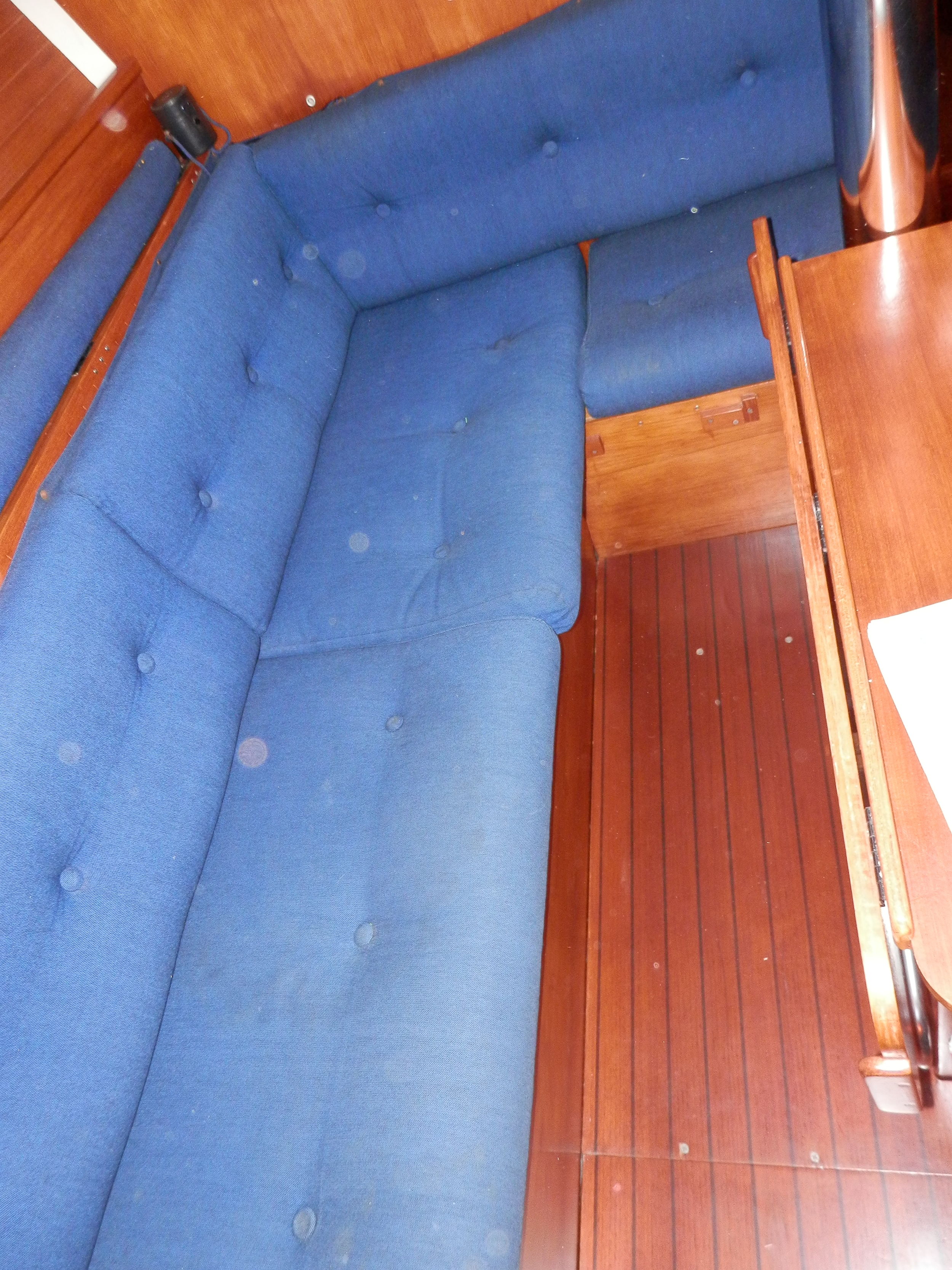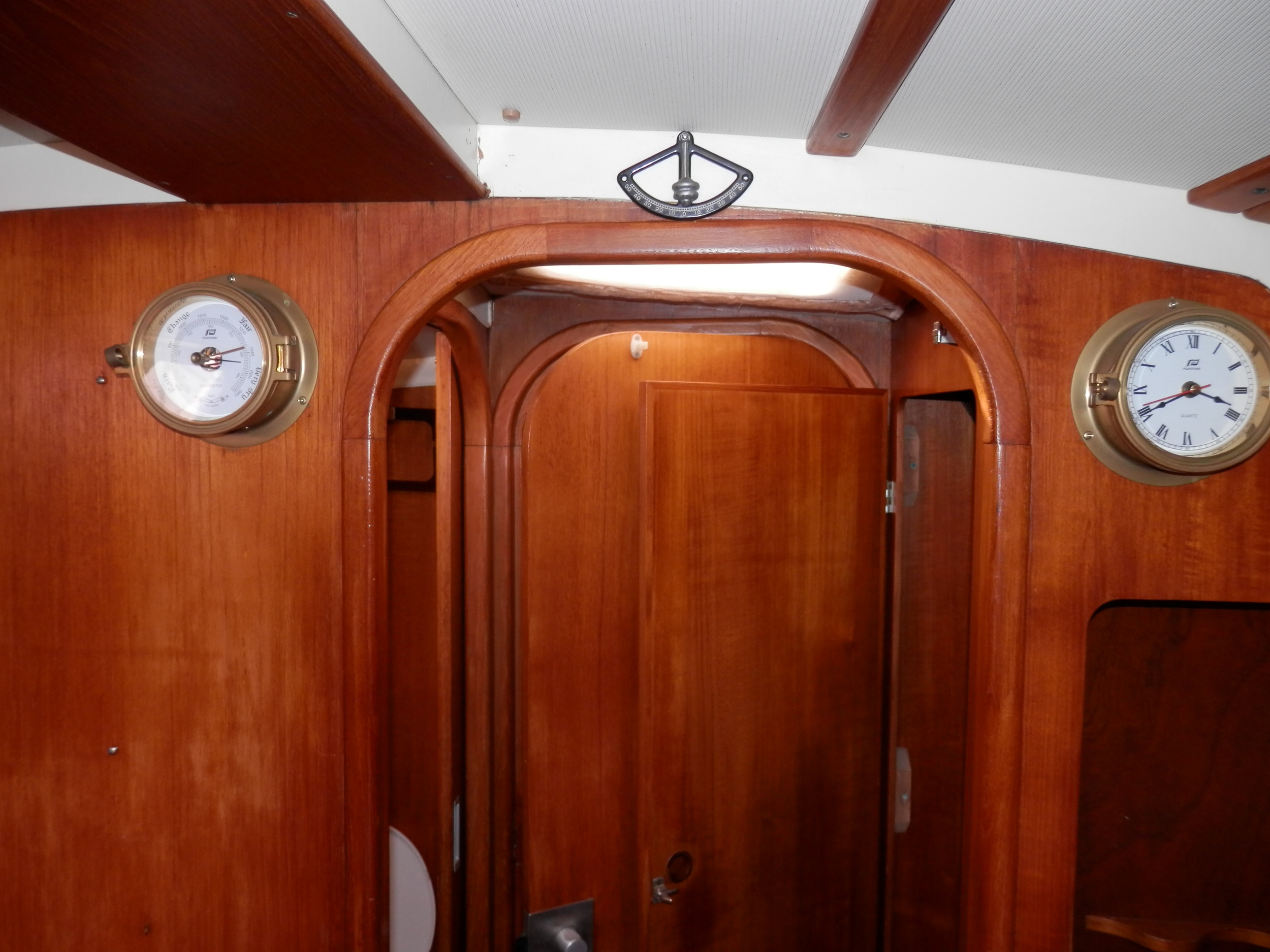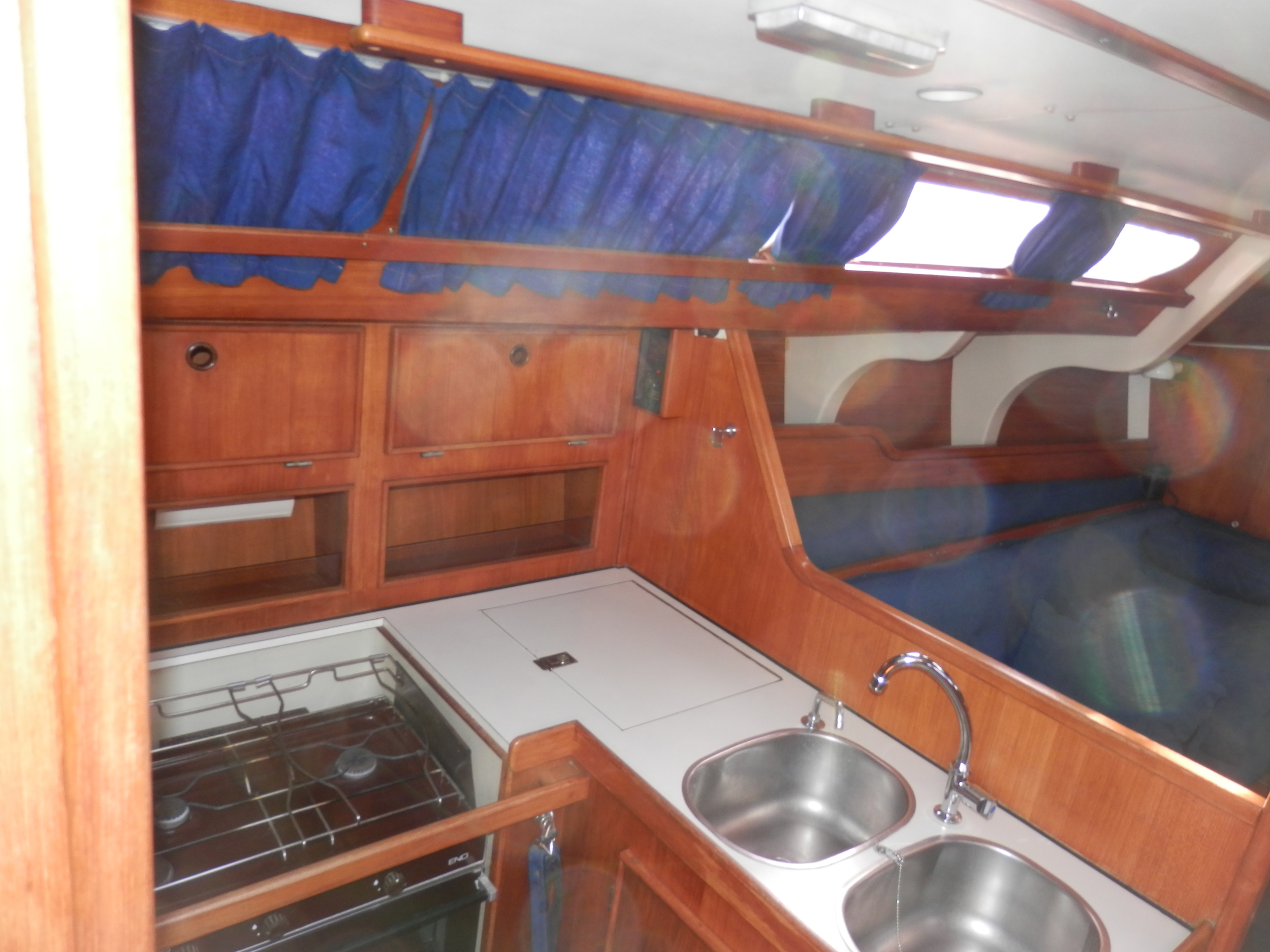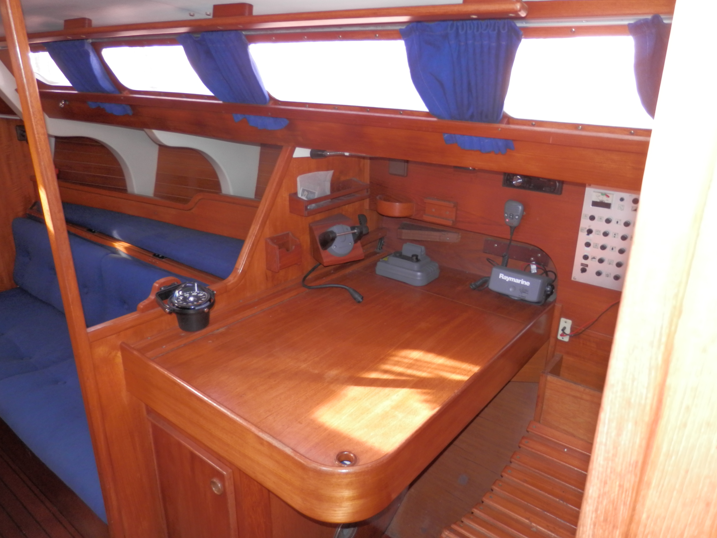 Het interieur is van gelakt teak en de boot biedt zowel veel leefruimte als opberg mogelijkheid. De salon heeft een zithoek met en uitklapbare tafel in het midden waarin de zwaard bediening is gemonteerd. Aan bakboord is een L-vormige keuken met bovenlader koeling en veel opbergmogelijkheid voor proviand. Naast de ingang stuurboord is de navigatie tafel. Er zijn 6 slaapplaatsen in de drie hutten en 4 extra slaapplaatsen in de salon. De natte cel is aan bakboordboord naast de ingang van het vooronder.