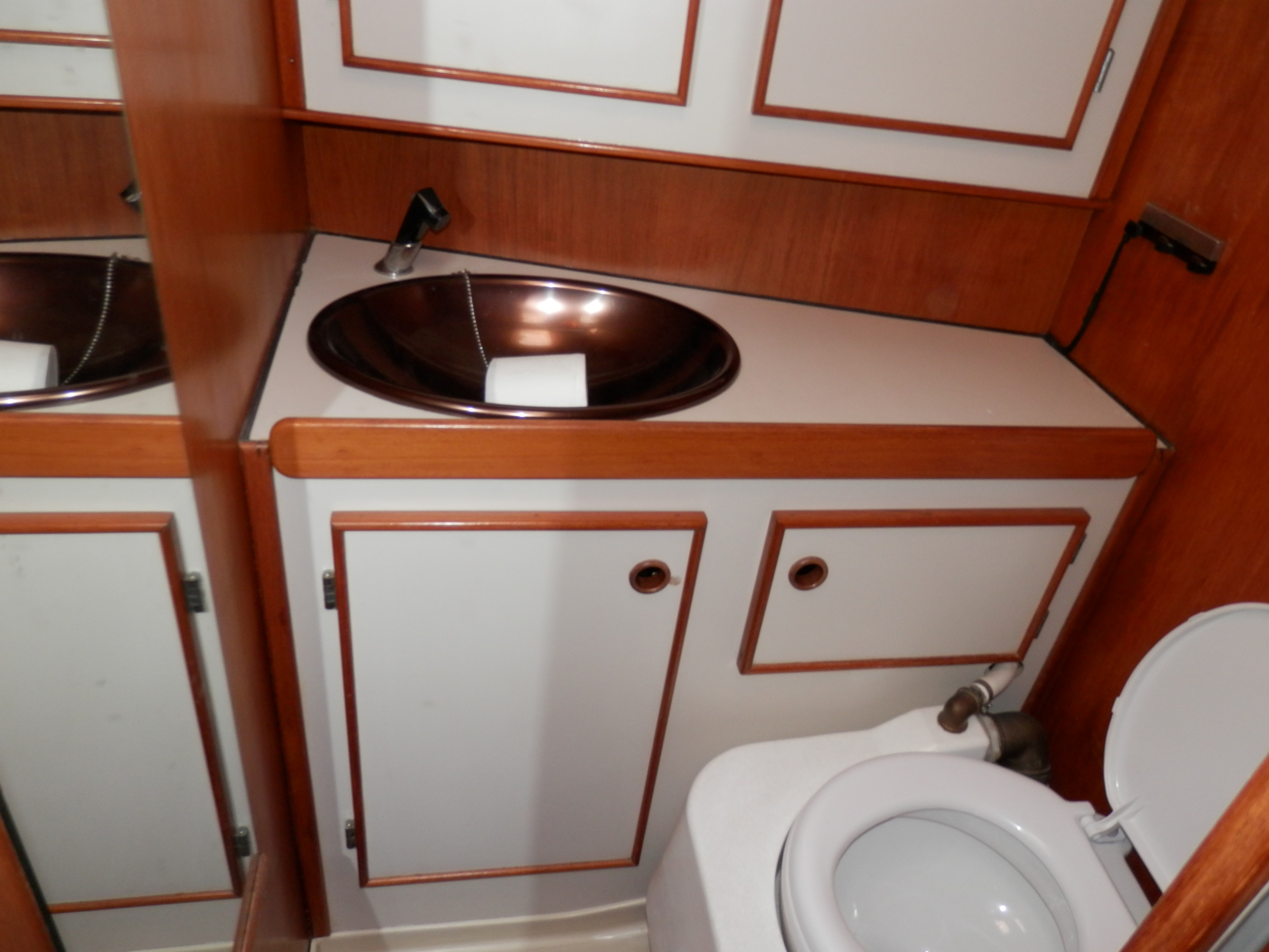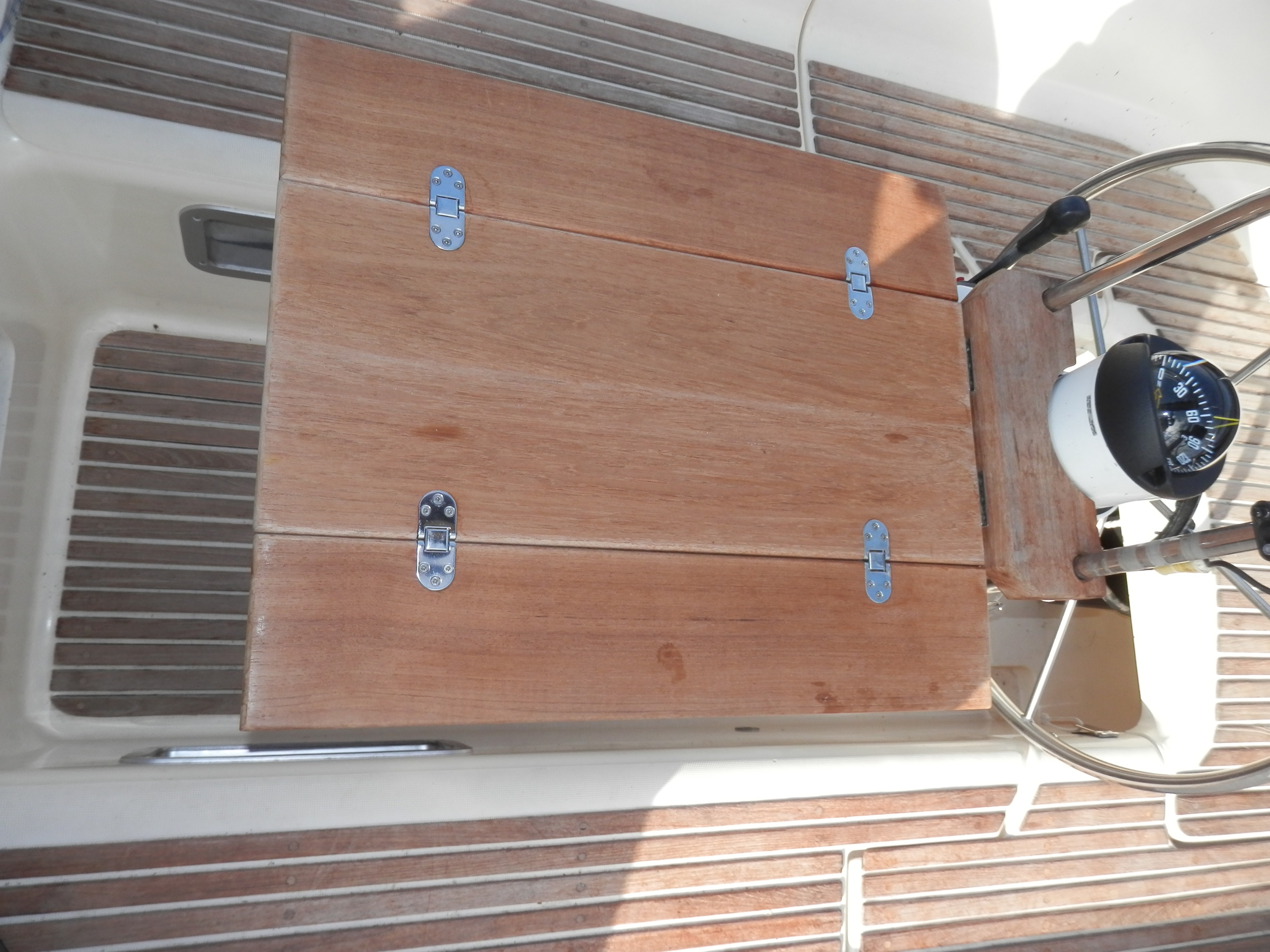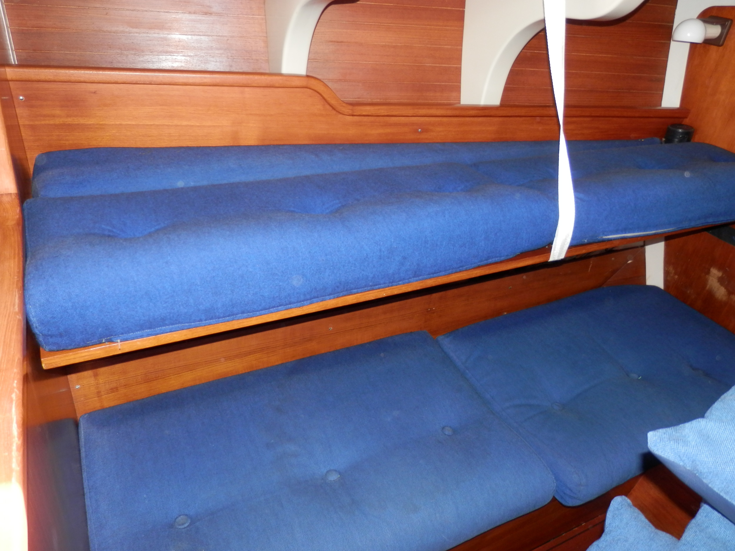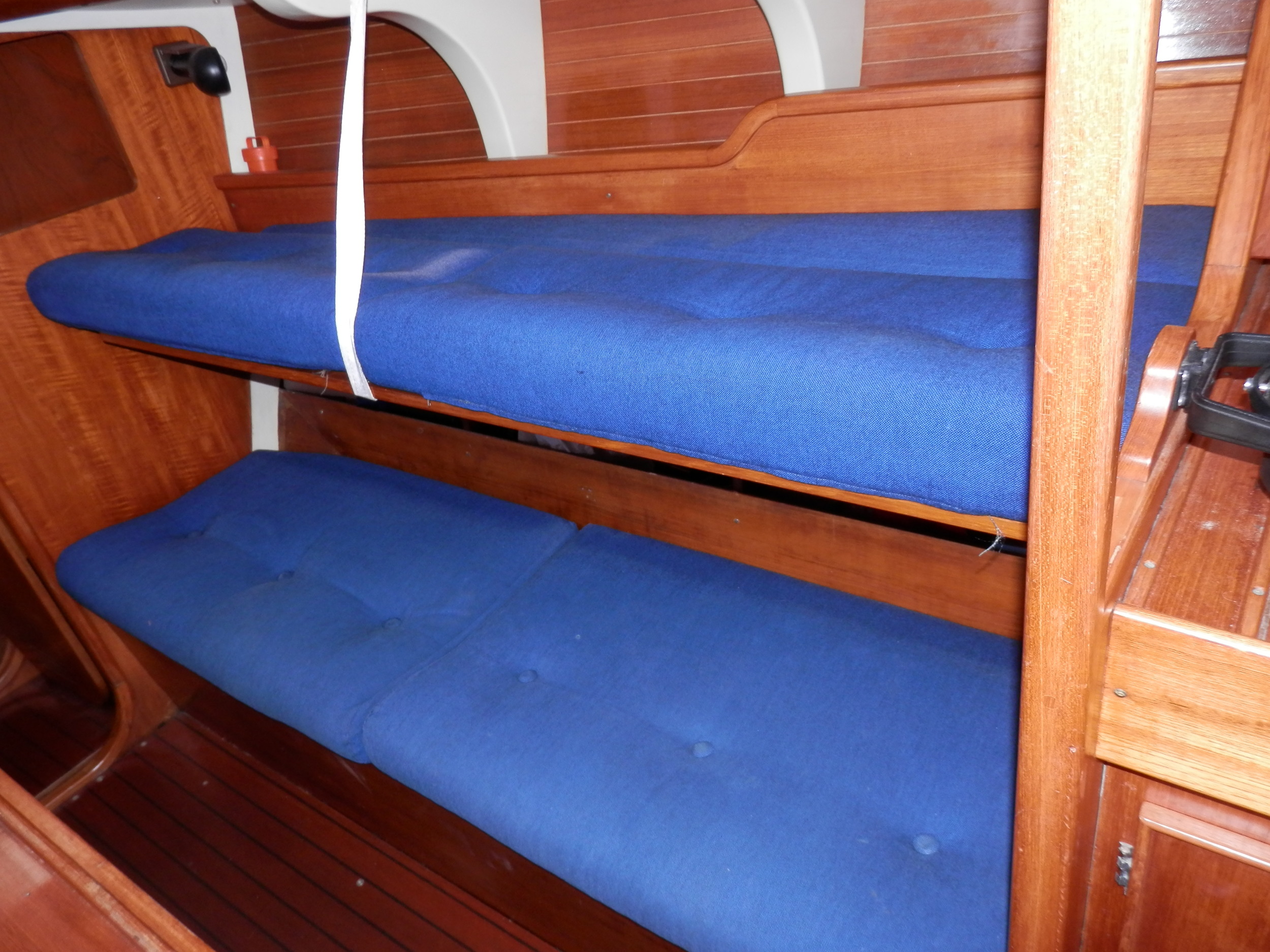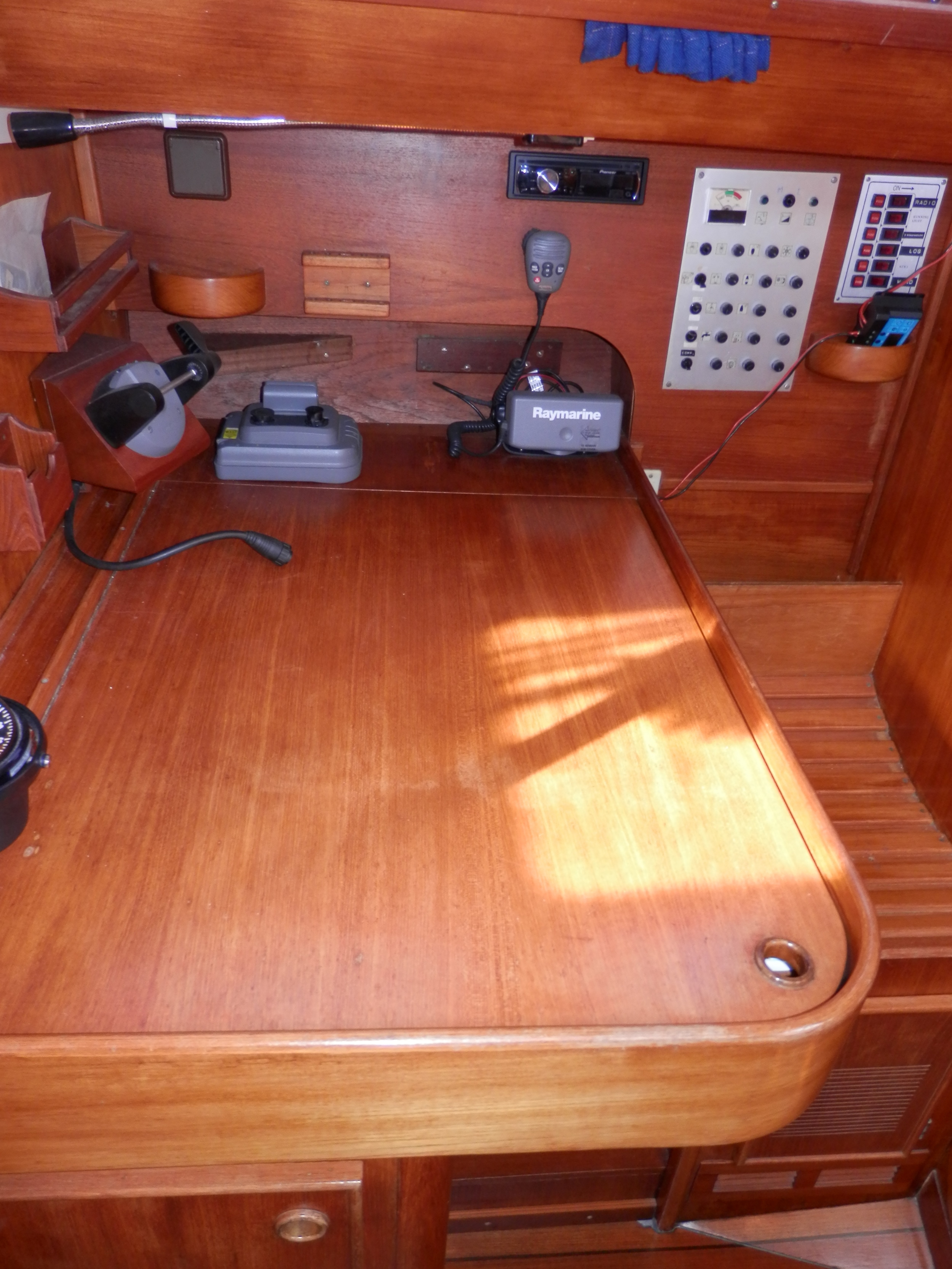 Het interieur is van gelakt teak en de boot biedt zowel veel leefruimte als opberg mogelijkheid. De salon heeft een zithoek met en uitklapbare tafel in het midden waarin de zwaard bediening is gemonteerd. Aan bakboord is een L-vormige keuken met bovenlader koeling en veel opbergmogelijkheid voor proviand. Naast de ingang stuurboord is de navigatie tafel. Er zijn 6 slaapplaatsen in de drie hutten en 4 extra slaapplaatsen in de salon. De natte cel is aan bakboordboord naast de ingang van het vooronder.